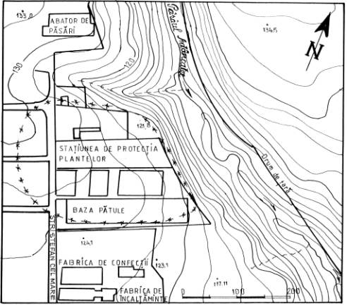 (La zone nord-est de la ville de Târgu Frumos où on trouve l'habitat du type Précucuteni). - x - x: limitele posibile ale aşezării