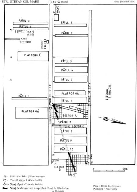Fig. 2. Târgu Frumos: planul general al punctului Baza Pătule, cu secţiunile şi suprafeţele săpate în sectoarele A-E (le plan général du lieu dénommé Baza Pătule avec les tranchées et les surfaces fouillées dans les secteurs A-E).