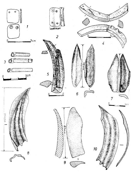 Fig. 8. Târgu Frumos. 1-2: aplice din valve de scoică de râu; 3: mărgele din oase tubulare; 4-10: obiecte de podoabă pe colţi de mistreţ (1-2: des appliques en valves de moules de rivière; 3: des rassades en os tubulaires; 4-10: des objets de parrure sur des défenses de sanglier).