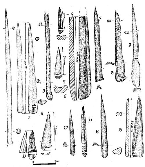 Fig. 9. Târgu Frumos: ace şi împungătoare realizate pe oase (aiguilles et poinçons réalisés en os).