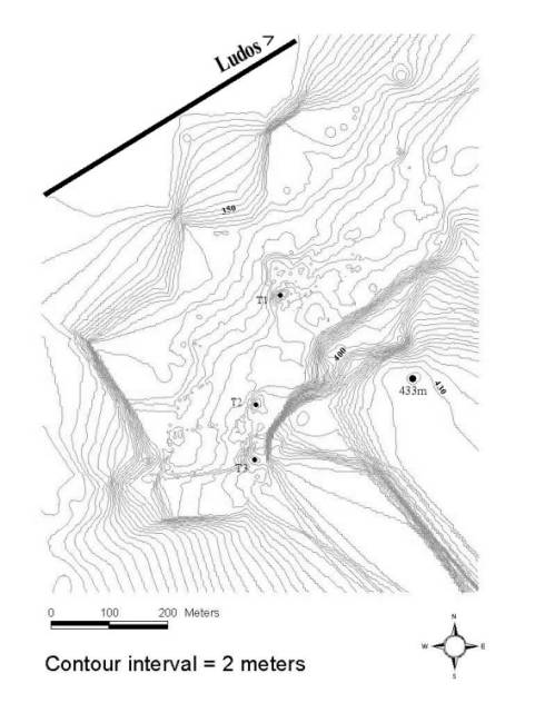 E-NE de T2 şi al treilea cu o mare orientare NE de T3, aproape de