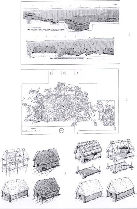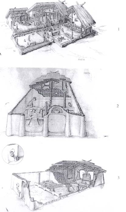 16. 1. Parţa. Reconstituirea unor case cu etaj (după Lazarovici şi colab. 2001); 2-3.
