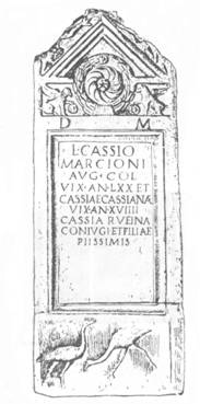 Câteva observaţii cu privire la stela funerară a unui augustal din Ulpia Traiana Sarmizegetusa -rezumat- Stela funerară a augustalului L. Cassius Marcio de la Ulpia Traiana Sarmizegetusa, decedat la vârsta de 70 de ani şi a fiicei sale, Cassia Cassiana, care a trăit 19 ani, ridicată evlaviosului soţ şi evlavioasei fiice (coniugi et filiae piissimis) de către Cassia Rufina, este decorată în partea inferioară cu doi struţi, imagine care ar putea sugera mai curând prezentarea unor astfel de "păsări de peste mare" în amfiteatru de către augustal, în calitate de munerarius, decât o origine africană a acestuia. De altfel, Cassius este un getilicium de origine orientală, care provine de la denumirea scorţişoarei în unele limbi semitice. În partea superioară a stelei, motivul celor doi grifoni care flanchează o rozetă turbionară simbolizează, pe de o parte, nădejdea renaşterii într-o altă lume, sub protecţie solară, pe de altă parte sugerează însăşi rostul augustalilor în lumea romană, anume acela de "păzitori ai ordinii universale", garantată de patriotismul supuşilor, organizat prin cultul imperial, al lui Augustus şi al Romei. Monumentul se datează, după L. Ţeposu-Marinescu, în prima jumătate a sec. II, iar după C. Ciongradi în perioada severiană.