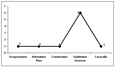 As we can notice from the above list of coins, the group of coins is quite compact. Coins were issued by the emperors: Vespasianus 1, Antoninus Pius 1 (from which 1 for Faustina I), Commodus 1, Septimius Severus 6 (from which 1 for Iulia Domna and 3 for Caracalla) and Caracalla 1, in Roma (see the table and the graphic).