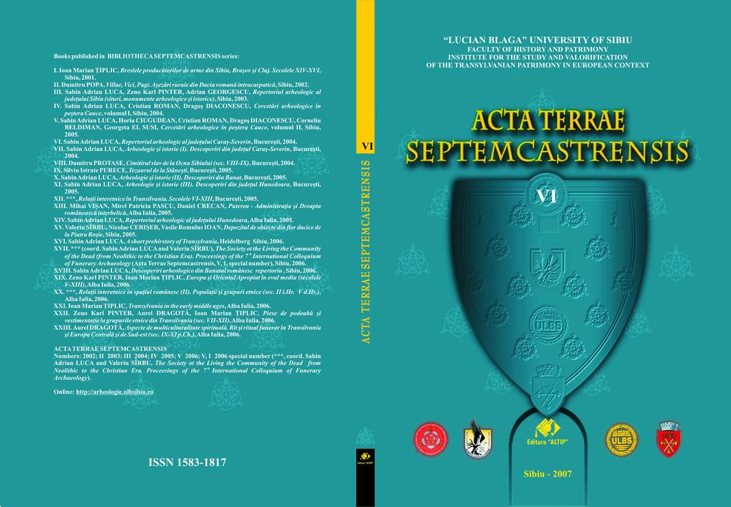 ACTA TERRAE SEPTEMCASTRENSIS VIEditorial board: Editor:Sabin Adrian LUCA (Universitatea „Lucian Blaga” din Sibiu, România); Members: Paul NIEDERMAIER (membru corespondent al Academiei Române), (Universitatea „Lucian Blaga” din Sibiu, România); Krum BACVAROV (Bulgarian Academy of Sciences, Institute of Archaeology and Museum, Sofia); Dumitru PROTASE (membru de onoare al Academiei Române) (Universitatea „Babeş-Bolyai” Cluj-Napoca); Paolo BIAGI (Ca’Foscary University Venice, Italy); Michael WHITE (Sussex University, Brighton, United Kingdom); Michela SPATARO (University College London, United Kingdom); Zeno-Karl PINTER (Universitatea „Lucian Blaga” din Sibiu, România); Marin CÂRCIUMARU (Universitatea „Valahia” Târgovişte, România); Nicolae URSULESCU (Universitatea „Al. I. Cuza” Iaşi, România); Gheorghe LAZAROVICI (Universitatea „Eftimie Murgu” Reşiţa, România); Thomas NÄGLER (Universitatea „Lucian Blaga” din Sibiu, România); Secretaries: Ioan Marian ŢIPLIC (Universitatea „Lucian Blaga” din Sibiu, România); Cosmin SUCIU (Universitatea „Lucian Blaga” din Sibiu, România) |