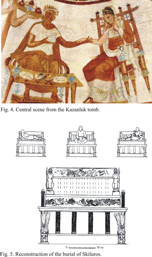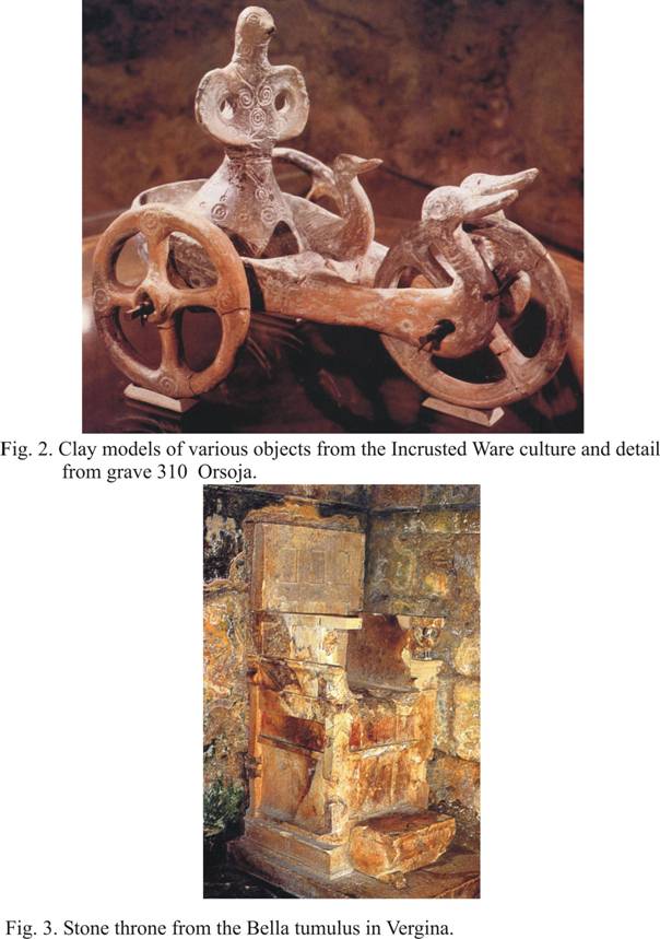 The eternity of the Burial Rite. The throne and the sitting Deceased Diana Gergova, Institute of Archaeology with Museum (Sofia), Bulgaria, A number of attempts were made in recent years to systematize the enormous source base on burial rites in ancient Thrace. The numerous aspects of the Thracian burial were united in a coherent system under the concept of immortalization ( Гергова 1996). Nevertheless, there remained aspects, notably the burials in sitting position, which only recently attracted the attention of researchers ( Гергова 2000, 2002, 2004). A reason for the marginalization of this interesting aspect is the circumstance that the examples from the Thracian area are not numerous and have not been well documented. Among them are the graves mentioned by F. Kanitz, which are made of slabs or bricks resembling little rooms in which the skeletons are in sitting position, from the village of Shipkovo, Yasenovetz area near Kazanluk, the information about a sitting skeleton in the biggest of the three Rahmanlii tumuli (Шкорпил, 1898, p. 35, 126), as well as the 13 sitting burials discovered below an earth and stone embankment in Tumulus 8 near the village of Gela, Menyov Kamak locality, Smolyan district, dated to the 7th-6th century BC. Two individuals are buried in the centre of the tumulus, surrounded by the remaining eleven who are seated on niches in the rocks (information of V. Naydenova and K. Kissyov). The archaeological research in recent years provided evidence that makes it possible to approach the examining of the issue of the genesis, development and content of this type of burials. The models of chairs-thrones and the real stone thrones discovered in the interior, as well as themes in the painted decoration of tombs, are indisputably closely connected with the theme. R. Tomlison treats the stone thrones in the Macedonian tombs as important evidence that men and women did not use beds but were seated during the ritual feasts. That author associates this practice with the influence and with the traditions of Thrace, indicating the iron models of chairs from the necropolis in Sindos (560-510 BC) (Fig. 1). The cited models are just an element of a specific complex of models of tables and chairs, of chariots loaded with wood, of two-wheeled chariots in which horses modelled from clay are harnessed and accompanied by a third riding horse, of platforms for firewood and skewers depicting ritual scenes (Tomlison 1993). Some authors perceive in its formation the influence of the Cretan-Mycenaean traditions or of Egypt, and only the fragmentary influence of Thrace (Соколовска 1997, 55, 62). The genetic link of this phenomenon with the much earlier traditions of the incrusted ware culture from the Late Bronze Age along the course of the Lower Danube was indicated by D. Gergova (Valeva, Gergova, 2000, 188-189). This culture belongs to a society with a clear religious doctrine and symbolism, which are represented in the burial rites, as well as in the diversity of the labrys models, lozenges and astragals, of male and female idols, thrones and tables, chariots pulled by swans, ornithomorphic vessels, boats, etc. Grave 310 from the necropolis near the village of Orsoja containing an urn with charred bones and a clay throne with a female anthropomorphic idol on it is of special interest. The monuments discovered suggest a link with the idea about the triunity through the cult of the Great Goddess-Mother and of the twins: the lunar Artemis and the solar Apollo, who periodically headed north, to the lands of the Hyperboreans. Both the myth about the Hyperboreans and that about the reincarnation, about the child deity Dionysos Zagreus, are connected with that culture (Бонев 2002, Шалганова 2001) (Fig. 2). Comparative analysis of the asynchronous Late Bronze Age necropoleis from the lands along the Danube and those from the Early Iron Age from Macedonia (Sindos) indicate that the grave complexes with cult objects or scenes – the earlier ones made of clay and the later ones of iron – represent a small percentage of the total number of discovered graves, being found in burials of individuals belonging to different gender and age groups (Шалганова 2001, 2002). Out of eight graves with such models in Sindos, one is the grave of a child, three are female and four are male (Tomlison 1993). This circumstance suggests that the placing of cult objects in the graves is predetermined by the specific social and religious status of a specific social group that can most probably be referred to as priestly or royal-priestly (Гергова 2002). It would be logical to assume a common ideological and ethnic-cultural tradition of that ritual phenomenon. A common doctrinal model with already established norms and burial practices finds a similar material expression and demonstrates a lasting and long-term manifestation. The character of the encrusted ware culture and its links with the Cretan-Mycenaean world, as well as the existence of Thracian personal names and toponyms in texts in Linear A and Linear B scripts from Minoan Crete, emphasise the special closeness between the two cultures and presuppose the probable presence of the same ethnic and cultural elements in the lands along the Danube River and on the Island of Crete. (Порожанов 1998,15-23) . However, the spreading of these innovations in the material and spiritual sphere both in the Balkans and in the Mediterranean region was apparently due to the infiltration of the carriers of the Late Bronze Age culture to the south, to the lands of Thrace and Macedonia. What was actually the role of the throne in cult and burial practices? According to the tradition, the initiation of Pythagoras took place in the cave of the Idean Zeus in the Dikte Mountain on the Island of Crete. He had to spend three times nine days there, and only then he was granted the right to look at the throne of Zeus th
