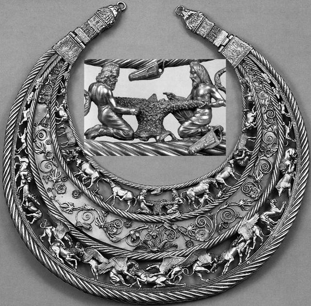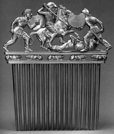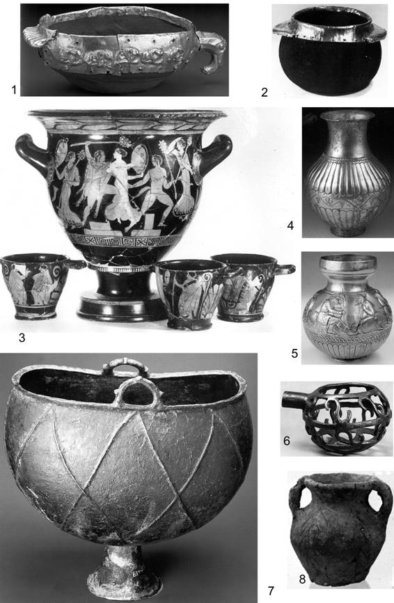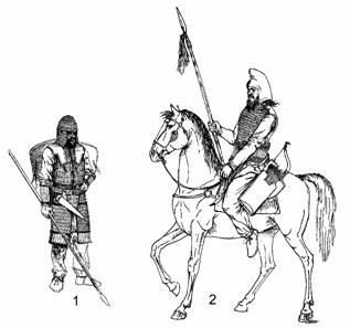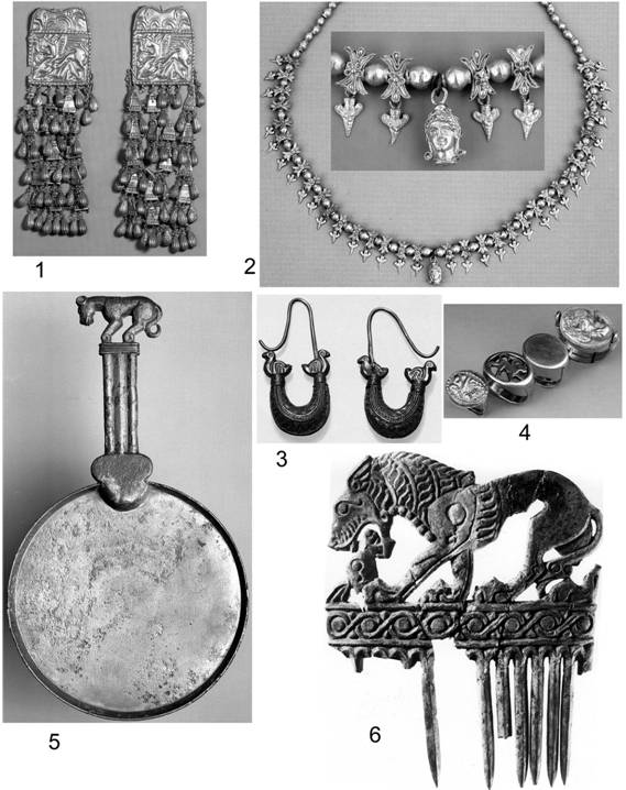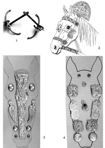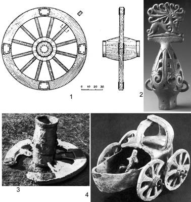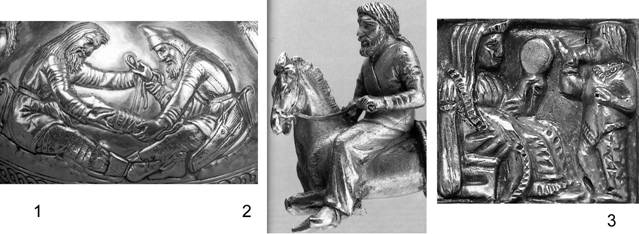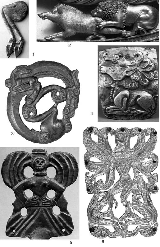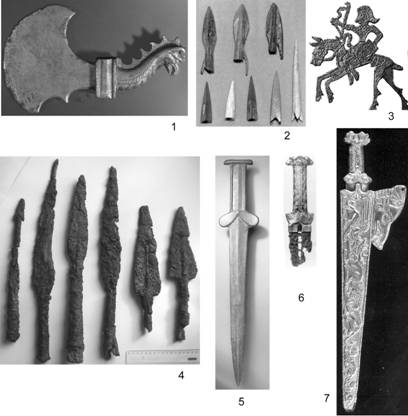 Traditionally the notion material culture involves a total combination of objects made by man to satisfy vital needs of a particular society. Since material culture is a mechanism for adaptation of a society to fit specific natural and social conditions, it actually represents nearly all aspects of life of an ancient ethnic group. These are natural environment, level of socio-economic and political development, surrounding and relations with neighboring ethnic groups. Two sources are available for studying the material culture of Scythians – written and archaeological ones. They complement each other nicely. While the former mainly addresses the early period of Scythian history, the latter gives an accurate account of the period of state formation and prosperity. Scythians had no written language, there are no records available. Books of Ancient Greek authors are the only source of obtaining information. And nine volume “History” by Herodotus is the most conceptual one. He visited the Northern Black Sea Area in the fifth century B.C. and provided us with fairly accurate and detailed picture of Scythian life, traditions and customs. So Scythians (as Ancient Greeks called them) are Persian-speaking nomads. Their state was formed on the principles of expansionist war policy and exploitation of the enslaved tribes and nations. Nomadic cattle-breeding was their main activity, the basis of their economy. That influenced all aspects of their life as mobile belligerent horsemen and primarily their houses. According to Herodotus (IV, 46, 127) Scythians did not build towns and fortresses, cart was their house. It made Scythians invincible to their enemies. In case of a halt or external menace they arranged their carts in a circle making a kind of fortress camp. Nomads lived in felt tents set up on carts; those were four- or six-wheeled vehicles. They were arranged like houses and had two or three compartments. Felt cover provided strong protection from wind, rain and light. Such wheeled houses were commonly drawn by two or three pairs of oxen. Remains of disintegrated carts can be found in some graves of Scythian aristocracy. Wheels had wooden hubs and spokes and also iron tires (Fig.1, 1,3-4). Rectangular bodies made of planks had low sides with multicolored painting. The upper part (felt cover) has never been preserved unlike metal decorations – bronze plates of various shapes on cover as well as bronze poletops (Fig.1, 2) at the corners and in the center ( Бессонова , 1981; Мелюкова , 1981; Болтрик , 1997; 1998; Болтрик , Савовский , 1991) . Since Scythians had no settlements, burials are the only comprehensive archaeological sources. It mainly concerns those of aristocracy as they are the reserves of most characteristic and unique samples of material culture. We recognize Scythian material culture by the so called triad - arms, bridle and animal-style works of art - peculiar to that very ethnic group. Arms and armor . Life and social organization of Scythians, especially early in their development, were fully determined by war. According to Herodotus, Scythia is a state where everyone is a mounted archer (IV, 46), that is a warrior. Due to permanent involvement in wars, particularly raids to Asia Scythians enriched their military experience and created their own weaponry. Bow and arrows were commonly used for attack. Arrowheads were found almost in every grave (their number varied from few pieces to several hundreds). At that time, arrowheads were mainly cast in bronze. But iron, bone and wooden ones of various shapes and sizes also existed (Fig.2, 2). Those made of bone and wood were used for hunting while metal ones for fighting. Wood staffs 45-84 cm long were sometimes color-striped. Rather small (only 60-70 cm) bow was made of wood, bone and tendons. Since the bow is rarely found its shape could be inferred only by pictures on works of art. (Fig.2, 3). A special sheath of wood and leather - a quiver - was used to keep and carry bow and arrows. Scythian aristocracy commonly used gorytos - sheathes decorated with gold plates ( Черненко , 1981) . Spears and javelins were rather popular (Fig.2, 4) . Short ones (up to 2 m long) were used for close combat and throwing, while long ones (up to 3 m long) were used for mounted battle ( Мелюкова , 1964) . Swords and daggers, the so called acinaces, were of vital importance to Scyths. Their length averaged 50-60 cm, the longer ones up to 1 m, the majority of them being double bladed ( Черненко , 2002) . Throughout Scythian period only shapes of sword pomme and guard have undergone changes ( Fig.2, 5-7 ). Scabbard for carrying sword was made of wood and leather often with gold decoration. Scyths were also armed with battle-axes (Fig.2, 1), maces and hammers. Protective equipment of Scythians. Its basic piece was a leather shirt with small metal (iron or bronze) plates sewn on fabric like fish scales. Brigandine might be long or short, sleeved or sleeveless. It was light and did not hamper easy movement, it provided a warrior strong protection . Sometimes brigandine was supplemented with shoulder straps . Belt was an integral part of the armor; it consisted of metal scales and served the dual function of protecting and fastening nearly all arms, whetstone, whip and cup . To protect head they used helmet. At first, it was cast ( Cuban type ), later a lighter forged Greek type appeared and since 5 century B.C. iron-scale helmet came into common use . C uisses and greaves served for lateral and front leg protection, they covered side and front parts (leaving back parts uncovered as scales could hamper riding). In the fifth century B.C., much more lightweight and effective Greek type greaves appeared to protect shins . Shields were good protection means. Made of wood and leather, they differed in shape, had solid or scaled covering and were often decorated with ornamental plates ( Че