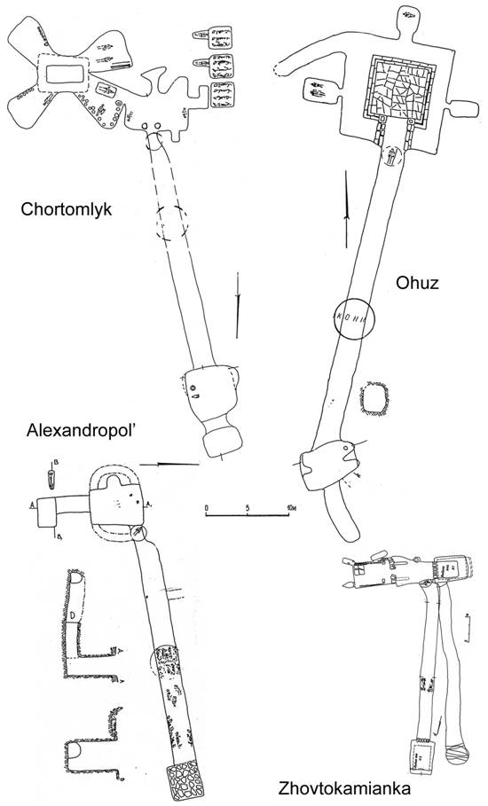 Barrows of the Scythian Tsars in the Second Half of the 4 th cent. B.C. (a Search for Historical Facts) Yuryi Boltryk, Institute of Archaeology, Kiev, Ukraine, Elena Fialko, Institute of Archaeology, Kiev, Ukraine, The present level of knowledge about the structure of steppe giant mounds as well as determination of the fact of simultaneous existence of their submound burial assemblies permit widening the information field available from the study of elite Scythian mounds (Fig.1). On the one hand, it is necessary because all the highest burial mounds of steppe Scythia, being very densely arranged both in time and in space, are almost completely studied. On the other hand, wide “noticeability” of these relics has led to attempts of revision of their ethnic attribution. I. Marasov assumes that Low-Dnieper burial mounds of the Khomyna Mogila (Khoma’s grave) type belong to the Thracian nobles (Marasov 1988). R. Ismagilov believes that the whole assembly of the “Low-Dnieper catacomb culture of the 5 th and 4 th cent. B.C.” was left by the early Sarmatians (Ismagilov 1994, 71). That is why we think it necessary to face the problem of attribution of the Scythian tsars’ graves provided that most researchers are inclined to see existence of the single state power in the Northern Black Sea area in the 4 th cent. B.C. A brilliant conception advanced by B.N. Grakov on transformation of the Scythian society in the reign of tsar Atei who is treated as a unifier of Scythia (Grakov 1950, 9-18) still has its adherents and opponents. A conclusion which was based on a sagacious guess about the interrelation between pictures showing Heracles with a lion and ideas about origination of the new branch of the Scythian tsars from Zeus via Targitaus-Herakles and, in fact, purposeful appropriation of this symbolic picture either by Atei or by his clan (Grakov 1950, 12), has been supported by a ponderable argument after the discovery of Atei’s coin. This conclusion has been verified by a thorough mythological analysis of pictures and Scythian toreutics carried by D.S. Raevsky (1977, 164-170). The conclusions made by B.N. Grakov have been supported in the frames of historical analysis and developed by D.B. Shelov (1965, 18-19; 1971, 54-63), A.M. Khasanov (1975, 238-245), F.V. Shelov-Kovedyaev (1984, 146-147), V.I. Pavlenkov (1999, 194-196). They give Atei functions of the tsar who completed integration of Scythia as a whole under the guidance of the single central power and in whose reign the development of the Scythian state had reached its zenith. Another version treats Atei a local leader of the Scythians in Dobrugea. This opinion has many adherents, among them there are D.P. Kallistov (1969, 125-130), P. Alexandresku (1967, 91), V.A. Anokhin (1973, 39-40), E.V. Chernenko (1987, 81), S.I. Adrukh (1995, 75-80) and other. Sharing the views of B.N. Grakov in this discussion, we suggest our own indirect arguments and version that one of eminent tsar’s burial mounds is the grave of Atei. Comprehending that this assumption is very hypothetical because historical information is rather disperse and scarce, we still think it possible to propose our version. Besides, the process of chronological ordering of tsar mounds initiated by M.I. Rostovtsev and developed by the next generations of researchers (Rostovtsev 1925, 405, 432, 455; Brashiinskij, 1965, 89 – 109; Onajko 1970, 9-54) has been recently given a powerful incentive due to a series of suggestions made by A.Yu. Alekseev (1981, 75-83; 1984, 65-75; 1987, 28-39; 1992; 1993, 72-75; 2003). Such scientists as S.Yu. Monachov (1993, 68-70; 1999; 2003). and S.V. Polin (1993, 79-80; 1994, 105) have also contributed to refinement of dates of great Scythian graves. The works mentioned permit narrowing significantly a range of the most probable mounds of tsars proper, which makes it possible to construct a rather strict logic chain of relics. Pull-value information available on assembly Ohuz permits attributing it with confidence to not numerous group of tsars’ graves. That is why recognizing the largest three graves of the Scythian steppe as tsar graves (without quotation marks) we have to determine the time and succession of their appearance. The latest datings of Chortomlyk and Alexandropol’ state their chronological horizon as 340-320 and 325-300 B.C., respectively, and determine, in our opinion, the following tendency of their sequence: Chortomlyk – Ohuz – Alexandropol’. However, operations with absolute dates destroy at times this chronological chain. That is why it is expedient to use differentiating features when determining succession of these barrows. There is a steady statement for the 4 th cent. B.C. on existence of four tsars’ graves proper, i.e. we add mound Solokha to our chain. This 18 m high mound erected for two stages yields twice-thrice to giants of the second half of the 4 th cent. B.C. if taking into account labour expenditures, but in comparison with burial mounds of its horizon it may be referred with confidence to the range of tsars’ sepulchers. It is known at present that there are no more graves of such size in the steppe and forest-steppe zones of East Europe except for Tsarsky (tsar’s) mound on the Bosporus. One more indirect argument in favour of our chain is location of graves in space on one line, on a section of 126 km (from Ohuz in the south to Alexandropol’ in the north), i.e. on the so-called “tsar’s road’. That direction was probably the most important thoroughfare of Scythia and served a place for burying the most outstanding public figures: there were found the largest mounds of the Steppe (Deev, Kozel, Rogachik, Lemeshev, barrows near vil. Bolshaya Znamenka (№ 13 in particular); in the right-bank Dnipro territory there are, probably, Tovsta and Nechai Mogilas) (Boltryk 1990, 38-41). Limiting a range of relics we need to exclude the Nechai Mogila from the number of pretenders to the rank of tsar’