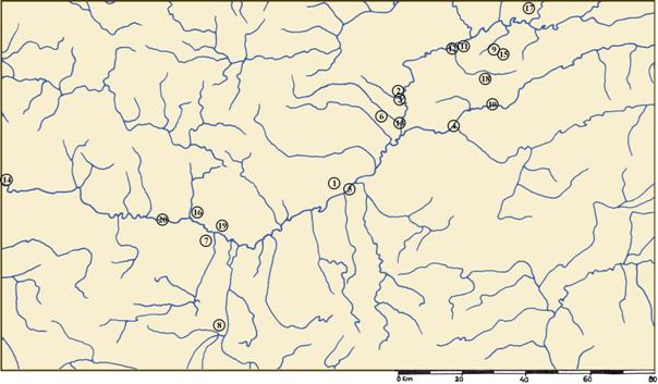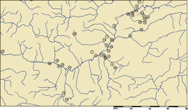 Pl. II. Discoveries dated on Early and Middle La Tène from the area of Middle course of Mureş River. 1. Acmariu; 2. Aiud; 3. Alba Iulia; 4. Blaj; 5. Blandiana; 6. Câlnic, 7. Craiva; 8. Cut; 9. Deva; 10. Gârbova; 11Gligoreşti; 12. Haţeg; 13. Heria; 14. Ighiu; 15. Jidvei; 16. Lancrăm; 17. Luncani; 18. Lunca Târnavei; 19. Micoşlaca; 20. Noşlac; 21. Oarda de Jos; 22. Ocna Mureş; 23. Ohaba Ponor; 24. Peţelca; 25. Săvârşin; 26. Sebeş; 27. Silivaş; 28. Şeuşa; 29. Şoimuş-Bălata; 30. Şona; 31. Şpălnaca; 32. Turdaş (Alba); 33. Turdaş (Hunedoara); 34. Uioara de Jos; 35. Uroi; 36. Veţel; 37. Vinţu de Jos; 38. Zlatna.