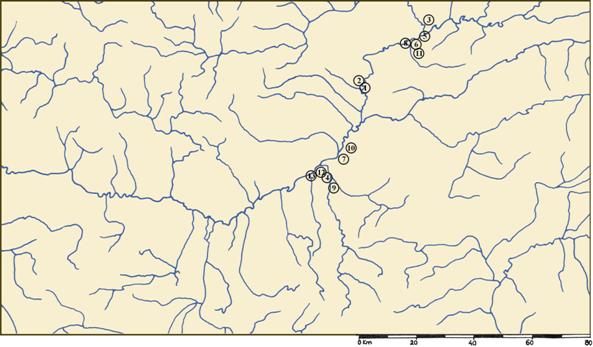 Pl. IV. Settlements dated on La Tène B and C, on Middle course of Mureş River: 1. Aiud - ,,Microraion III”, 2. Aiud - ,,Sub Pădure”, 3. Gligoreşti - ,,La Holoame”, 4. Lancrăm - ,, Glod”, 5. Micoşlaca, 6. Noşlac, 7. Oarda - ,,Cutină”, 8. Ocna Mureş, 9. Sebeş - ,,Podul Pripocului”, 10. Şeuşa - ,,La Cărarea Morii”, 11. Uioara de Jos, 12. Vinţu de Jos - ,,În râpa terasei dinspre Sibişeni”, 13. Vinţu de Jos - ,,Lunca Fermei”.