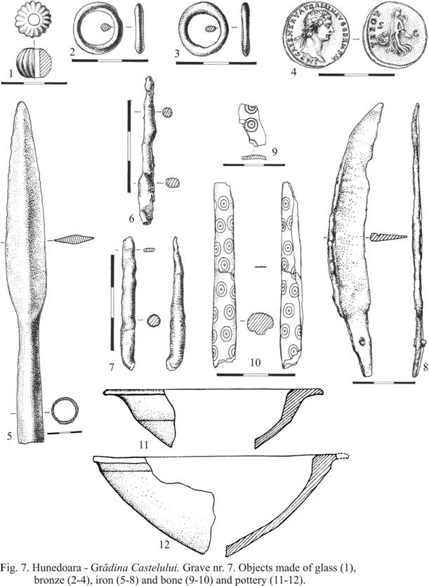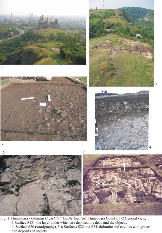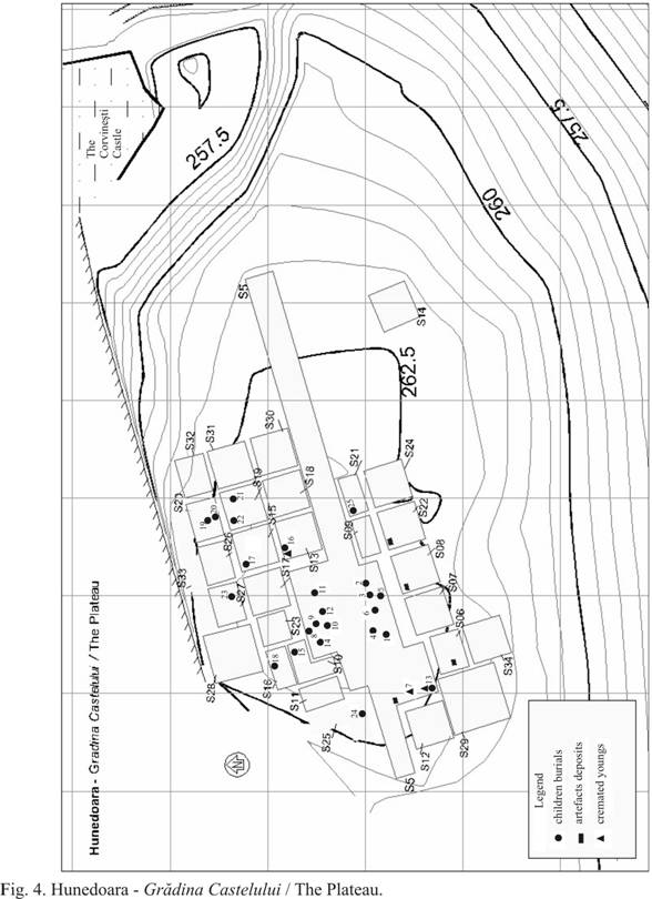Dacian settlement and children necropolis of Hunedoara. An unique discovery in the Dacian world. Archaeological approach Valeriu Sîrbu, Muzeul Brăilei, România, Sabin Adrian Luca, Universitatea „Lucian Blaga” din Sibiu, România, Cristian Roman, Muzeul „Castelul Corvinilor”, Hunedoara, România, Silviu Purece, Universitatea „Lucian Blaga” din Sibiu, România, Dragoş Diaconescu, Muzeul „Castelul Corvinilor”, Hunedoara, România, In the first part, we’ll refer to Hunedoara-Grădina Castelului and Hunedoara-Sânpetru, two very important sites for the knowledge of some aspects concerning the relations between “the world of the living” and “the community of the dead” at the Dacians. The two zones with vestiges are very close, but on different forms of relief: the settlement, on the Sânpetru hill and the valley of the Cerna river, the ritual inhumations of children (“the sacred necropolis”) and the votive deposits of objects, on the Grădina Castelului Plateau (Fig. 1/1-2) (Luca 1999, p. 48-55, pl. VI-IX;Luca et al. 2003, p.143-144; 2004, p.142-144; Sîrbu et al. 2005 1, p. 179-182; 2005 2, p. 21-22). Thus, we have the opportunity to know the life of certain communities on different levels, from the daily activities to the spiritual life. I.Hunedoara. Ia. Grădina Castelului - “the cildren necropolis” The deposits of children are situated in the highest part of a dolomite plateau, partially damaged by the building of the Corvin Castle (Fig. 1/1-2). The geological analysis (made in 2004 by geologist Eugen Orlandea), pointed out the existence, in the ancient times, of a rocky plateau, with peaks and cavities and the absence of human arrangements for the children deposits means they used the cavities already existent in the dolomite (Fig. 1/3-6). The zone with dead people seems to be on the SW – NE direction, grouped on nuclei, probably individualized not only topographically, but also by the types of inventories (Fig. 4). Sometimes we couldn’t establish the initial position of the children bodies because of their damaged condition, but also because of their young age. Some children have been put lying on their backs; others crouched on the right or on the left, usually covered with stones (Fig. 2, 3). The deceased are differently orientated, in fact towards all the cardinal points (Fig. 2, 5). The deposits are never superposed, nor crossed, which might indicate the inhumations made in a brief period of time, when the stones over them were still well marked. In most of the cases we are dealing with babies, with very fragile bones, consequently the skeletons are severely damaged, partly because their being close to the surface exposed them more to the environmental factors. Another finding consists of 25 deposits containing at least 39 individuals, 36 inhumed and 3 cremated. In each of 14 deposits there were only one individual, in each of four deposits, two individuals (in M13 a cremated and inhumed bodies was buried), in each of three deposits, three individuals (in M16, two inhumed and one cremated children), and in a single case, four babies (M12) (3 deposits of children are not yet analyzed) (the anthropological analyses made by Alexandra Comşa and Andrei Soficaru will be thoroughly presented in a book about the site). All the 36 inhumed bodies were of children, 18 of them being less than one year old, 25, less than two years old, 30, less than six years and only one was an Infans II. None of the three cremated bodies was a child, but only young or adults. In two deposits, (M13 and M16) there are inhumed new - born children and cremated teenagers. One of the problems we are dealing with remains the condition of the skeletons in the deposits. Taking into account the young age of the children, we could assume that some of their bones disappeared as a result of their fragility. Sometimes, we found skeletons without skulls (M16) or just parts of skulls (M19, M20). In certain cases, the findings consisted of isolated bones from different parts of the body and one could wonder whether they are the outcome of the initial deposits, intentional or not, or provoked by ulterior disturbing. We must point out they couldn’t come from the previous deposits, Basarabi culture (9 th – 8 th centuries B.C.) because all the discoveries of this period are only adults and not children. If there were some exposing/decomposition rituals of the corpses, previous to the inhumation, then it might be possible that some isolated bones had arrived by chance in the ulterior deposits (Sîrbu 1993, p. 31-36). One couldn’t notice traces of violence on the skeletons, but these little children could have been killed by means leaving no trace on the bones, such as strangling, choking, poisoning etc. The inventory is rich and varied enough, but differentiated, not only by the individuals, but also by the nuclei of dead. The inventory location is varied as well: a part of the jewels and clothing accessories is placed by the bodies in normal positions, while others, form the same categories of objects, have been found around the skeleton, but under the covering stones. It is possible that afterwards, some objects might have been moved from their original position. The clothing accessories and the jewelry are represented by high profile fibulae, beads, pendants, earrings, rings, appliqués, links (Fig. 6). The weapons consist of a knife and two arrow heads, near the skeletons, plus an iron spear head and a fragment of a bronze sword scabbard, found in the deposits area. To all these, one can add the iron and bronze tools and instruments. There was no pottery vessel near the children. According to the fibulae and coin, we may consider the deposits to date from the second half of the 1 st – beginning of the 2 nd century A.D., namely until Dacia was conquered by the Romans (106 A.D.). There are a lot of inhumations whose inventories couldn’t be situated in a short period of time, but