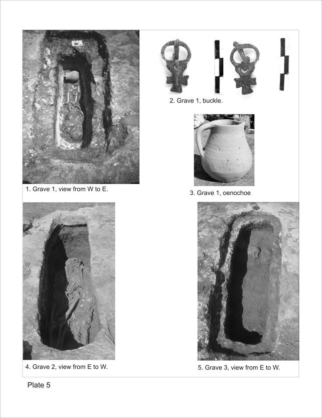 G1 (Plate 5 / 1): a child’s grave (according to the analysis of the teeth, the child is 5 - 7 years old), dug in 2000 by Dina Papathanasiou. The grave is east-west oriented, head to the west, an oenochoe was placed at the child’s feet (Plate 5 / 3) (Marrou 1999, p. 112 and Dennis 2001, p. 7, on the custom of taking food for the “voyage beyond” and Velkovska 2001, p. 21 – 45 on the Byzantine funeral ritual according to liturgical sources). In the abdomen area, towards the left shoulder blade, a bronze cross-shaped buckle was found (Plate 5 / 2) (analogy to Travlos, Frantz 1965, plate 43 / a, dated the 6 th / 7 th centuries).The bones are anatomically connected, which is indicative of the fact that the grave was untouched. Comparing the inventory with the inventory of the graves in a Samos cemetery, the grave is dated in the 6 th / 7 th A.D. For the dating of the oenochoe at the beginning of the 7 th century, see Robinson 1959, p. 122, plate 35 / N2. Dimensions: 1.07 x 0.32 and 0.35-0.50 m. deep