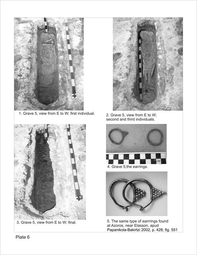 G5 (Plate 6 / 1 - 3) : this grave was dug in 2004, falls within type 2, with “patura”, contains three individuals placed one on top of the other. The bones are anatomically connected, with small exceptions at the feet area, but we believe that these interventions had been caused by roots, and not people. A moved mandible piece was found in the abdominal area possibly because of plant roots. After the removal of the first individual, it could be noted that the feet of the other two overlapped. We should mention the fact that the bones are very badly preserved and breakable at the slightest touch. The wear of the teeth indicates that these are adults over 30 years of age. The inventory of this grave includes only a pair of bronze earrings found in the head area on the bottom of the grave (Plate 6/ 4) One of the earrings is one open hoop terminating in a cylindrical eyelet. a granulated bunch of grapes is affixed to the lower part of one earring (analogy in Papanikola-Bakirtzi 2002, p. 428, fig. 551 dated in the 7 th century) (Plate 6/ 5). Dimensions: 1.83 x 0.50 x 0.70 m
