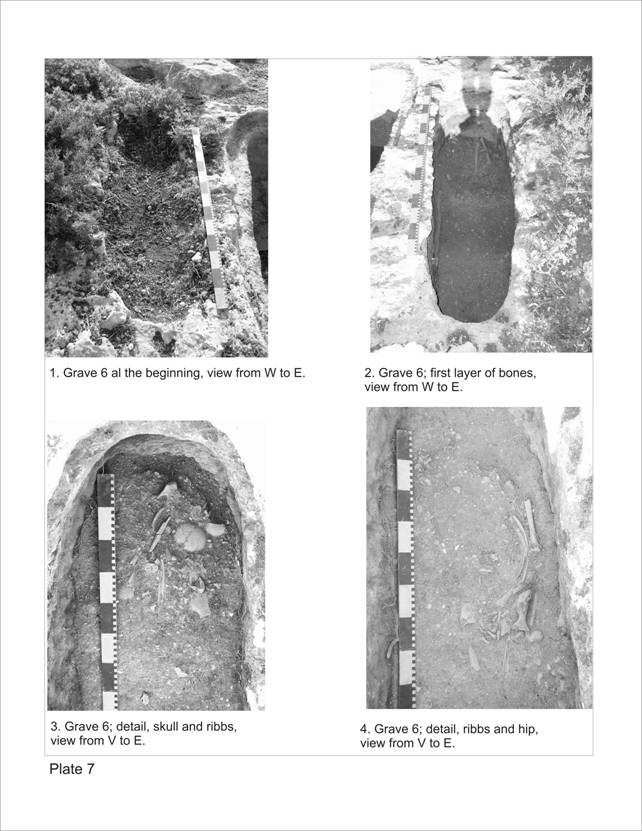 G3 (Plate 5/ 5) : situated immediately south, smaller in size, it includes two children’s skeletons, placed one at the side of the other. Under their heads there was a stone used as a «pillow ». Their position is indicative of the fact that they had been buried together. Dimensions: 1.40 x 0.47, 0.32 m. deep The other three graves contained poorly preserved bones and the total lack of inventory proves the economic difficulties of the period and the poverty of the settlement. Other two graves were also excavated, situated south – west of the previous group. The first (G4) included a group of three people, buried together, while the second was differently covered, with no patura , with only three cuts along the long sides. The absence of inventory does not provide for the precise dating of the graves, but their vicinity with and typology similar to the graves dug in 2000 allow us to date them back to the same period of time (the second half of the 6 th century – early 7 th century).