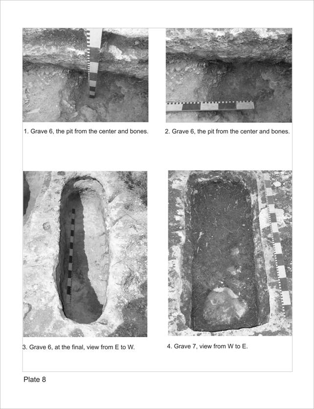 G7 (Plate 8/ 4) : 20 m. west of G6 we started to excavate another grave (with patura). At a 0.40 m. depth, stones and shards (small pieces very hard to identify) of Byzantine pottery were found. On the bottom of the grave, in the central zone, we found skull pieces. Because of this we can say that at a certain moment the grave had been used for another purpose (we do not believe that this grave had been robbed; if it had been robbed the bones would have been moved throughout the grave – it is possible that this grave had been used as a water tank in modern times). Dimensions: 1.69 x 0.53 x 0.67 m. deep