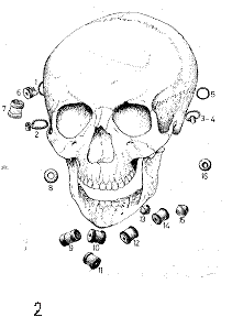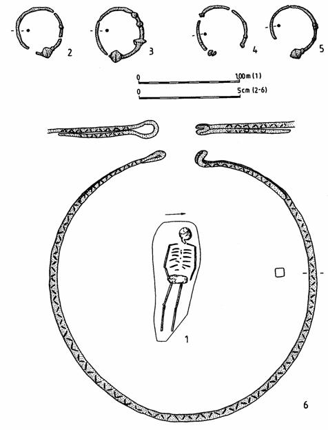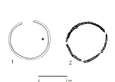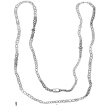 Pl. XXXII. 1. Reconstituire şirag mărgele, 2. Situaţie in-situ a şiragului de mărgele (după Bakay Kornel 1978 |