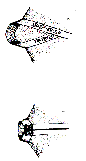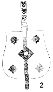 Pl. XXXIII. 1. Reconstituire costumaţie feminină decorată cu aplici din bronz; 2. Reconstituire sabeltasche decorată cu aplici din bronz (după Istvan Dienes 1972) |