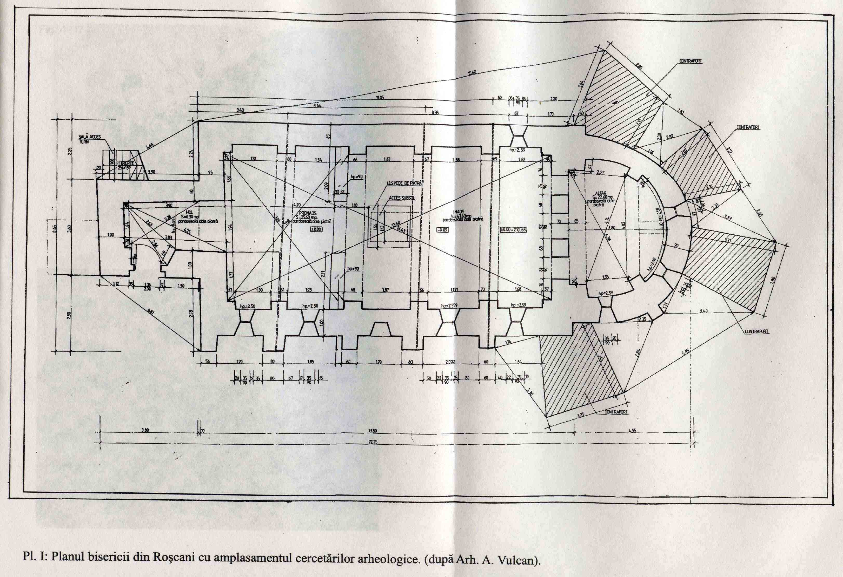 I: Planul bisericii din Roşcani cu amplasamentul cercetărilor