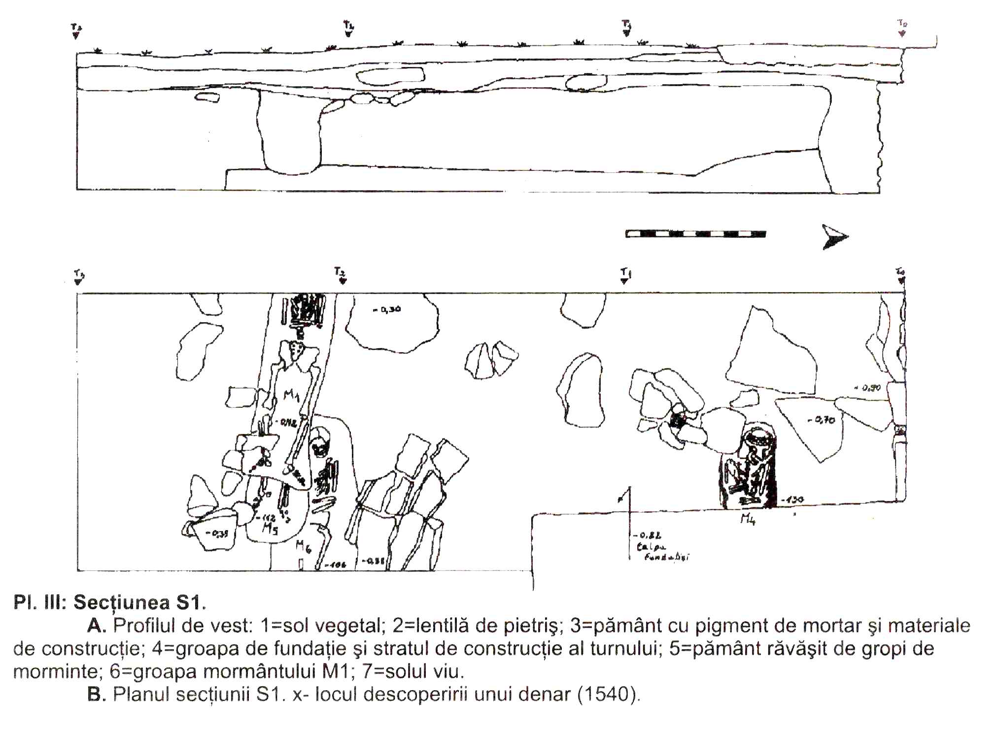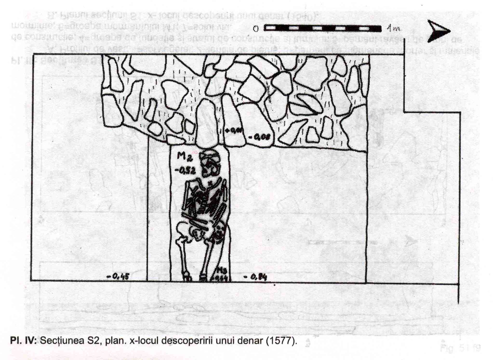 IV: Secţiunea S2, plan. x-locul descoperirii unui denar (1577).