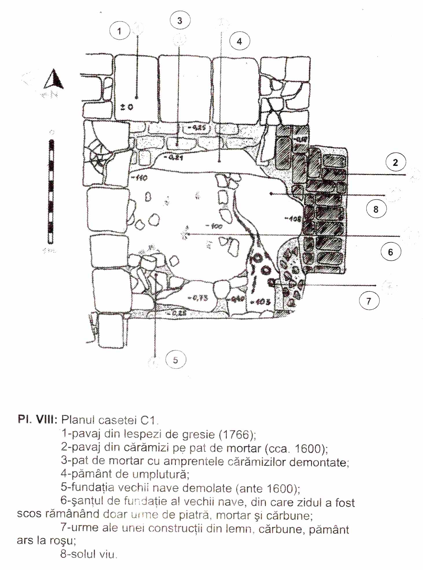 VIII: Planul casetei C1. 1=pavaj din lespezi de gresie (1766); 2=pavaj
