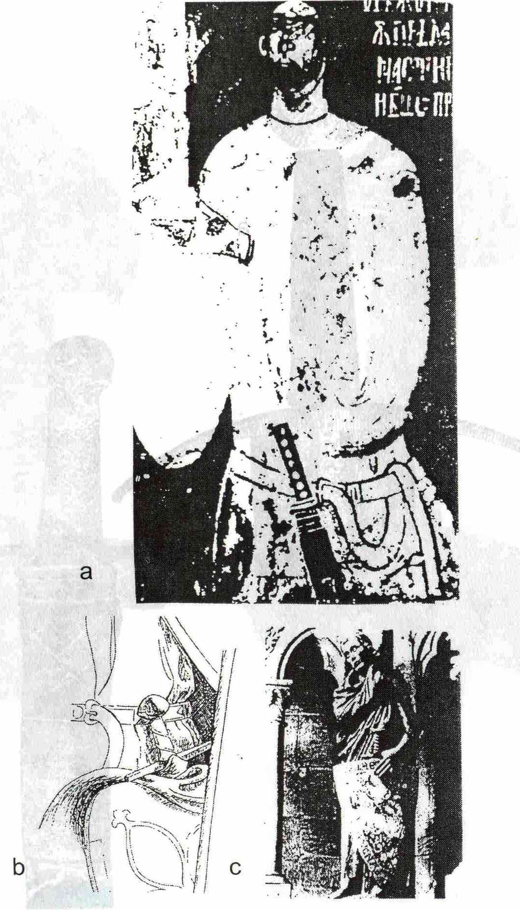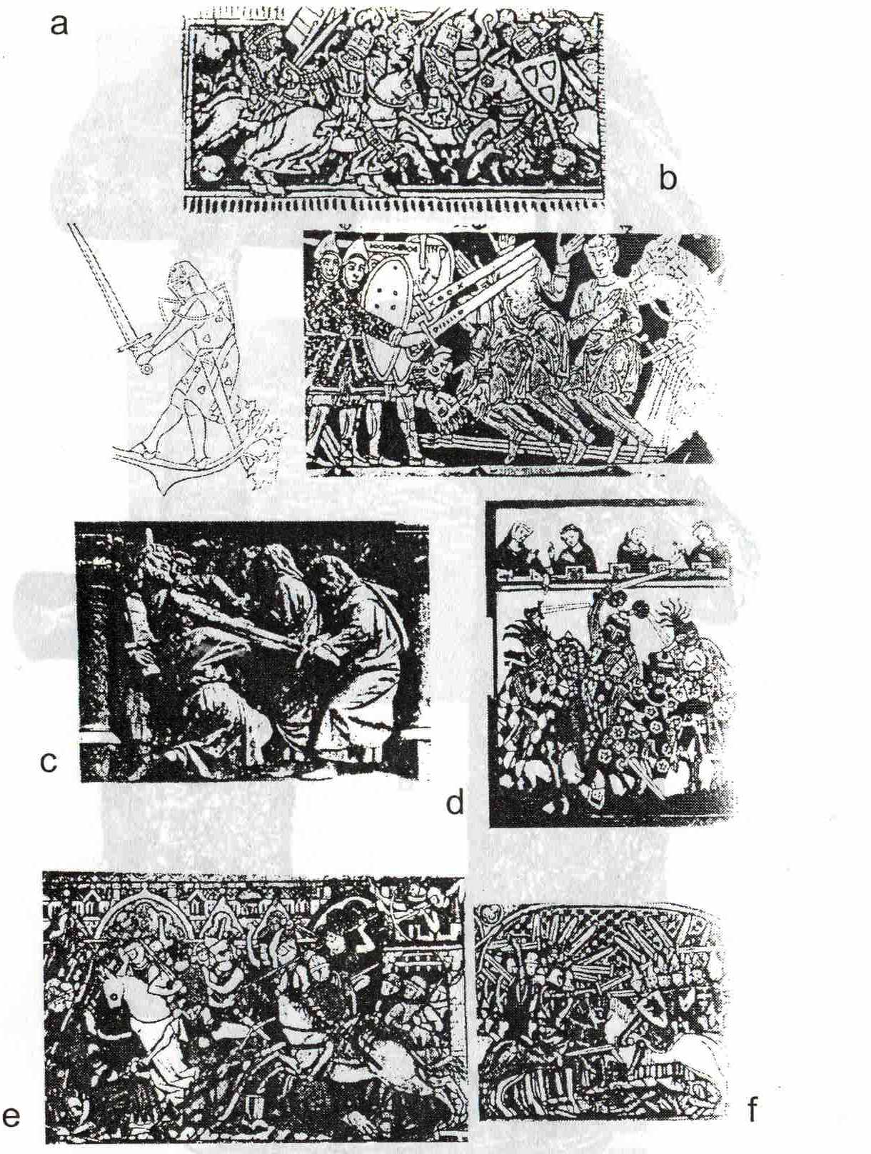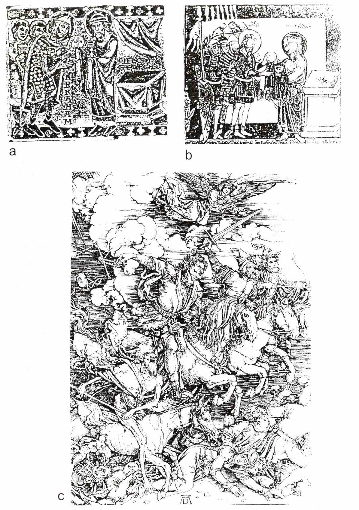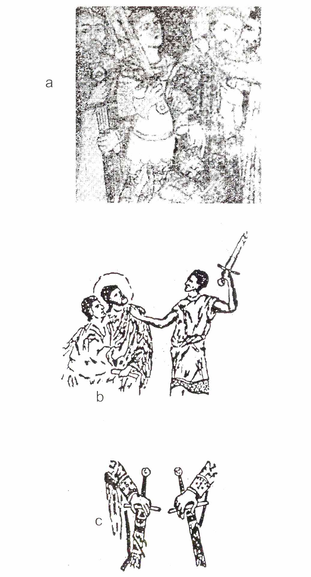 de cavalerie, reprezentare pe o centură maghiară de sec. XII; b, martirizarea Sf. Felix de pe altarul de la Abdinghof, cca. 1100;