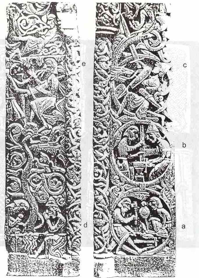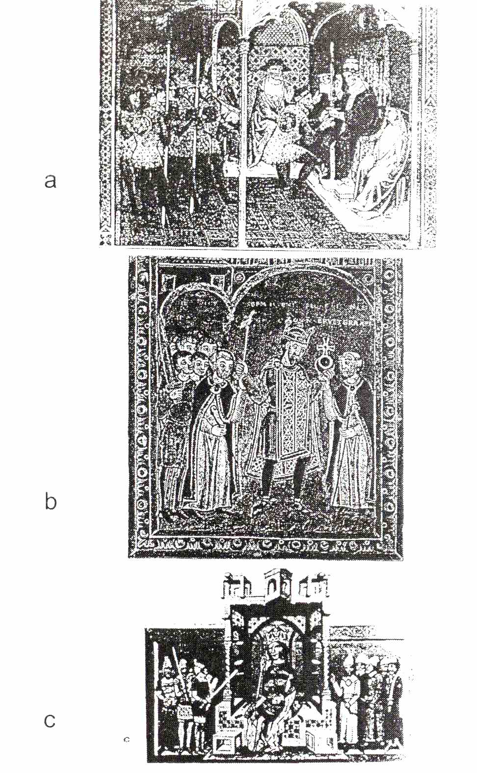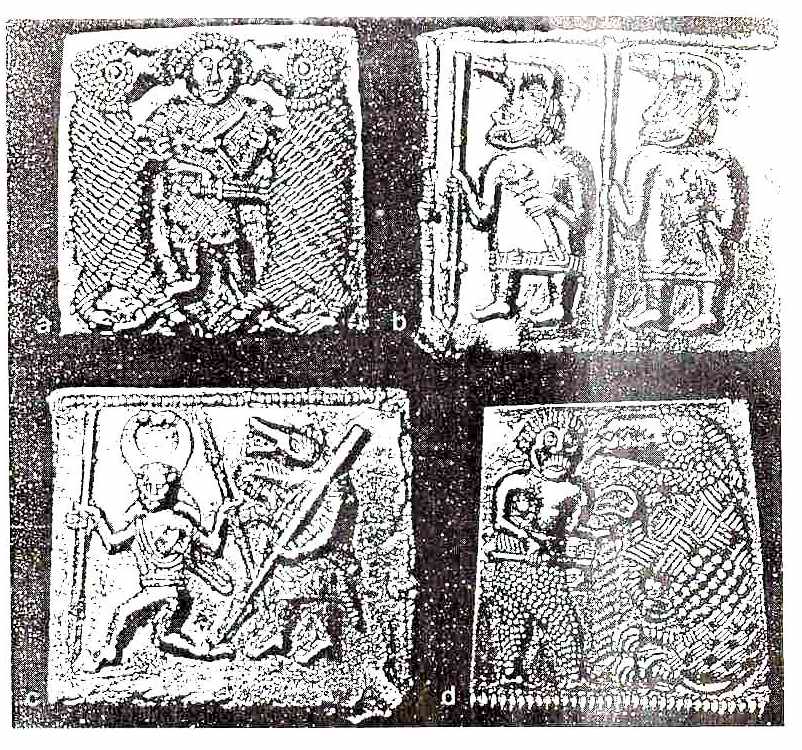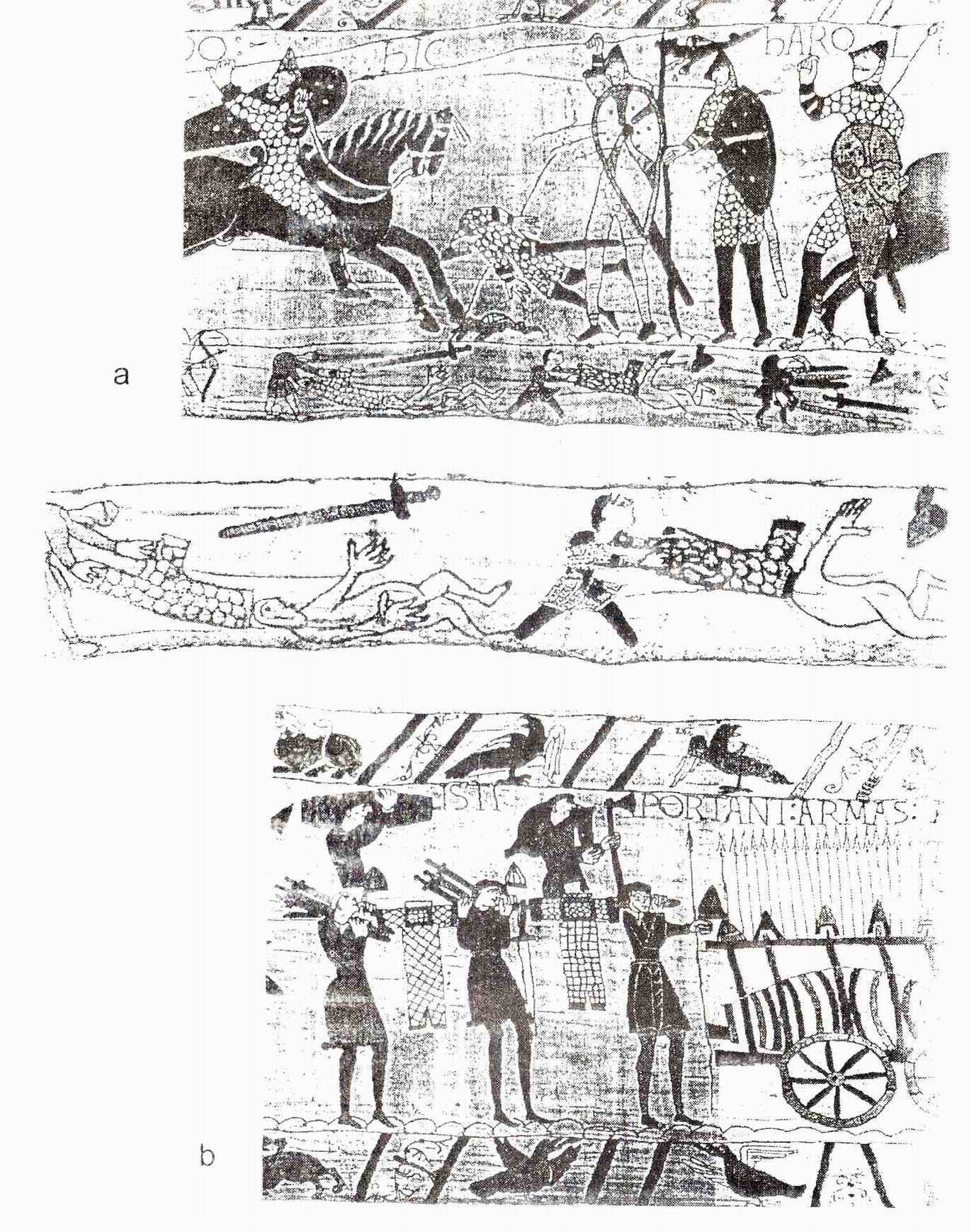 de cavalerie, reprezentare pe o centură maghiară de sec. XII; b, martirizarea Sf. Felix de pe altarul de la Abdinghof, cca. 1100;