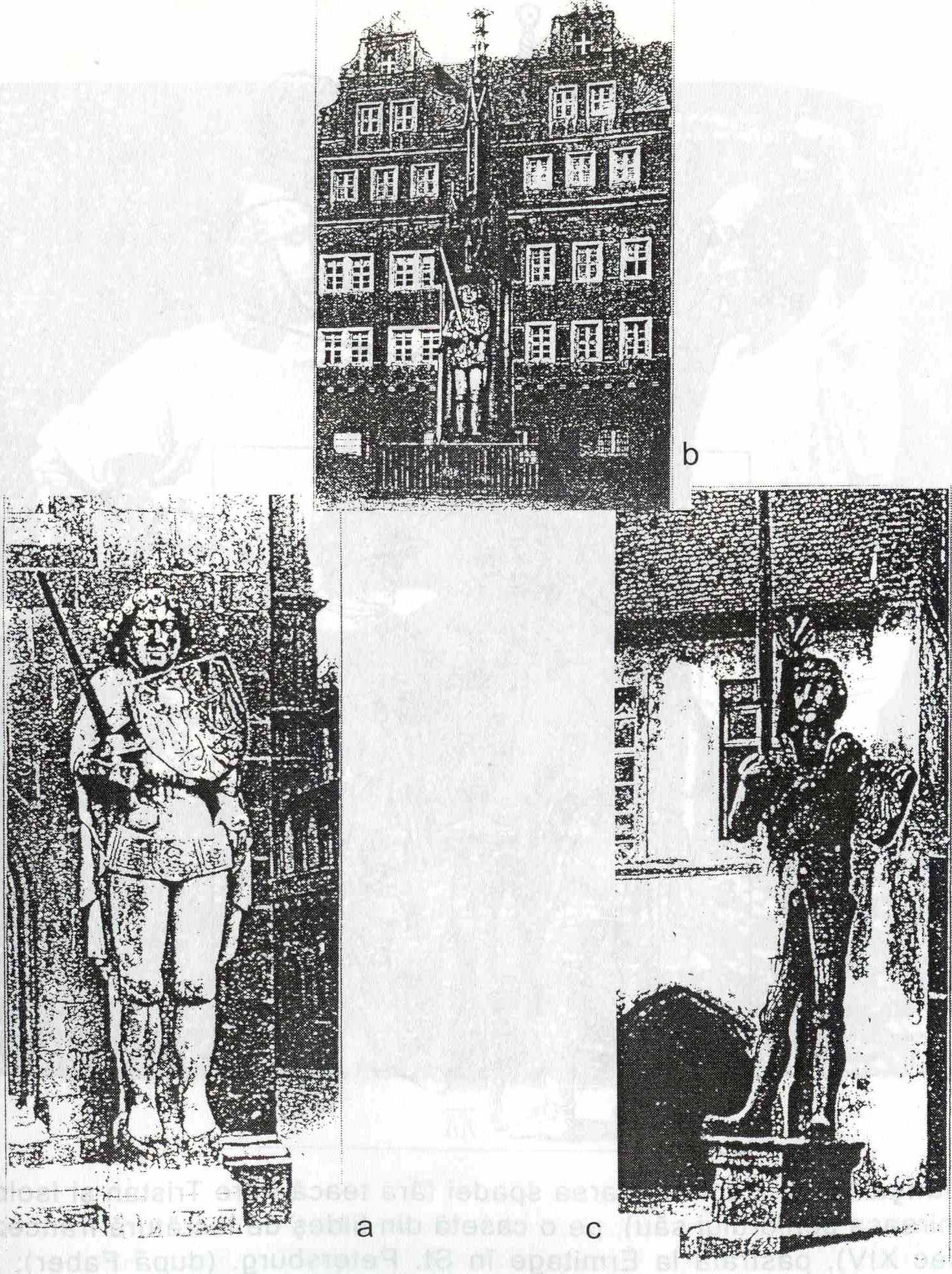 Planşa 11: "Rolandsäulen", stâlpi ai lui Roland în oraşe germane: a, Halberstadt; b, Zerbst; c, Stendal.