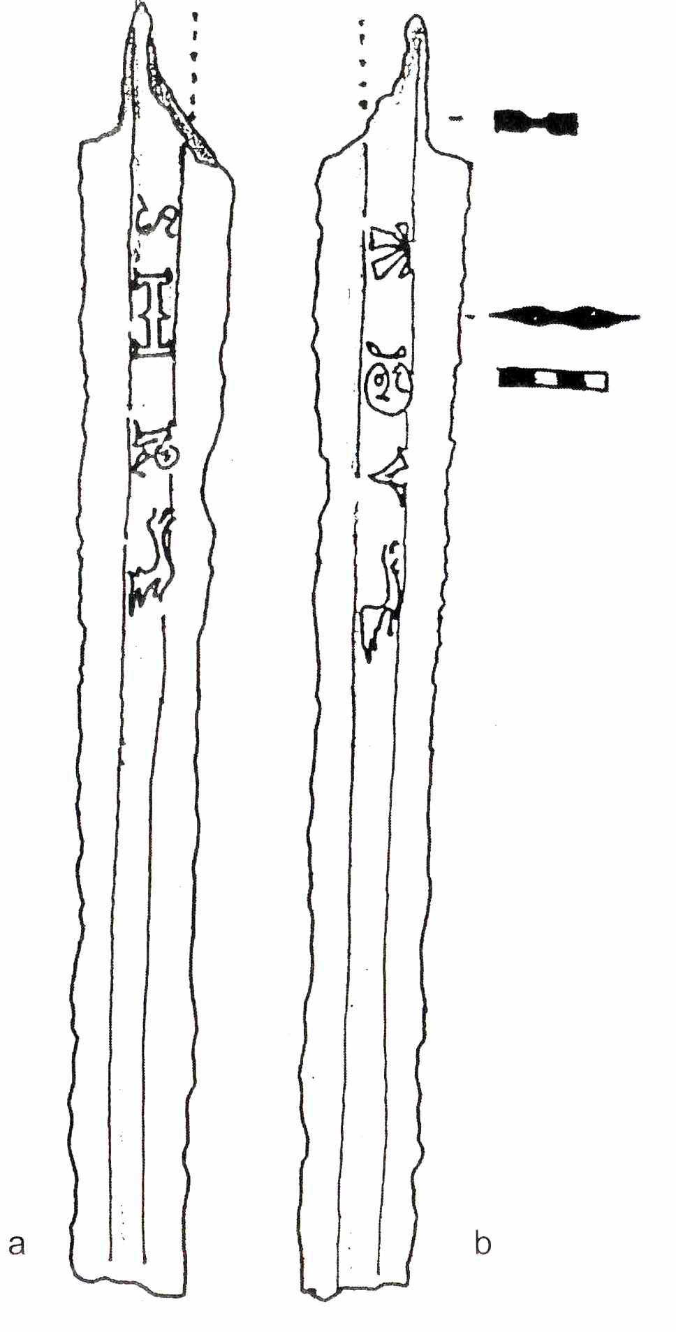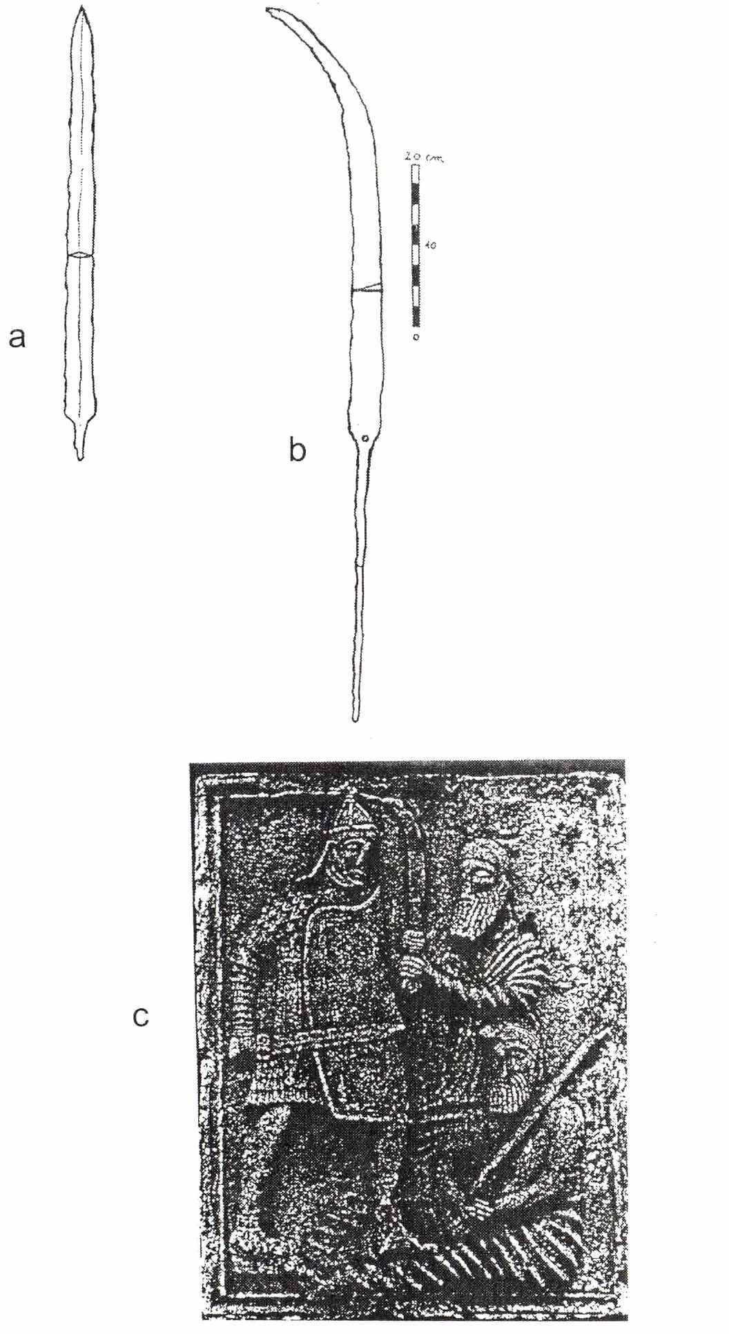 la Statensk Historionska Museum din Stockholm. (după Wilkinson) b, lance din mormântul de la