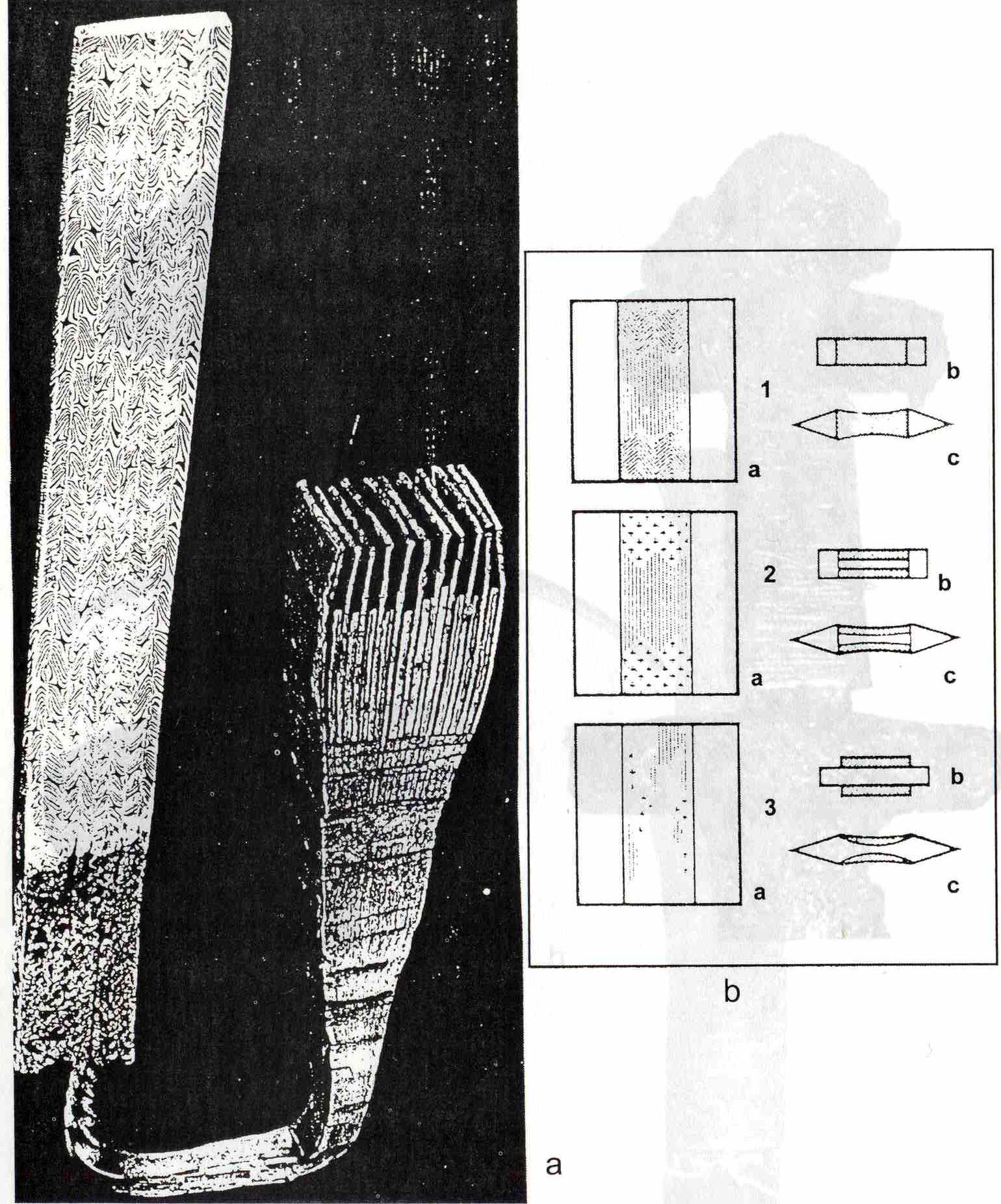 Planşa 29: a, Reprezentarea grafică a raportului dintre forţa de lovire a spadei-1 şi a sabiei-2; b, săbii-spadă (paloş) din secolul XI. (după Bakay); c, cavaler cu cămaşe de zale reprezentat în catedrala din Reims, 1251. (după Alpatov)
