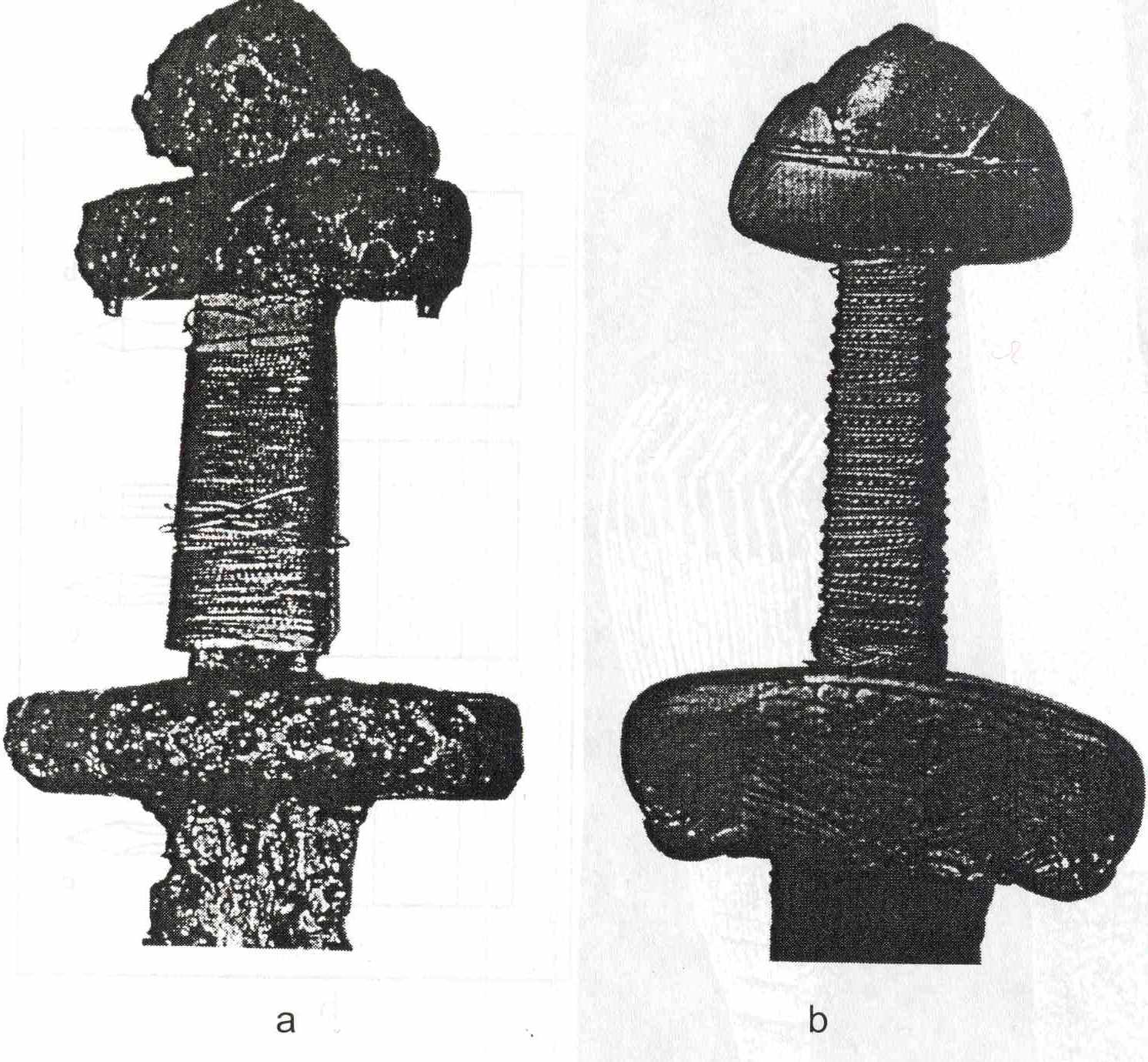 Planşa 22: Mânere nordice ornamentate; a, buton şi gardă montate separat şi mâner înfăşurat cu sârmă; b, buton şi gardă din os şi mâner înfăşurat cu sârmă. (după Schulze-Dörlamm)