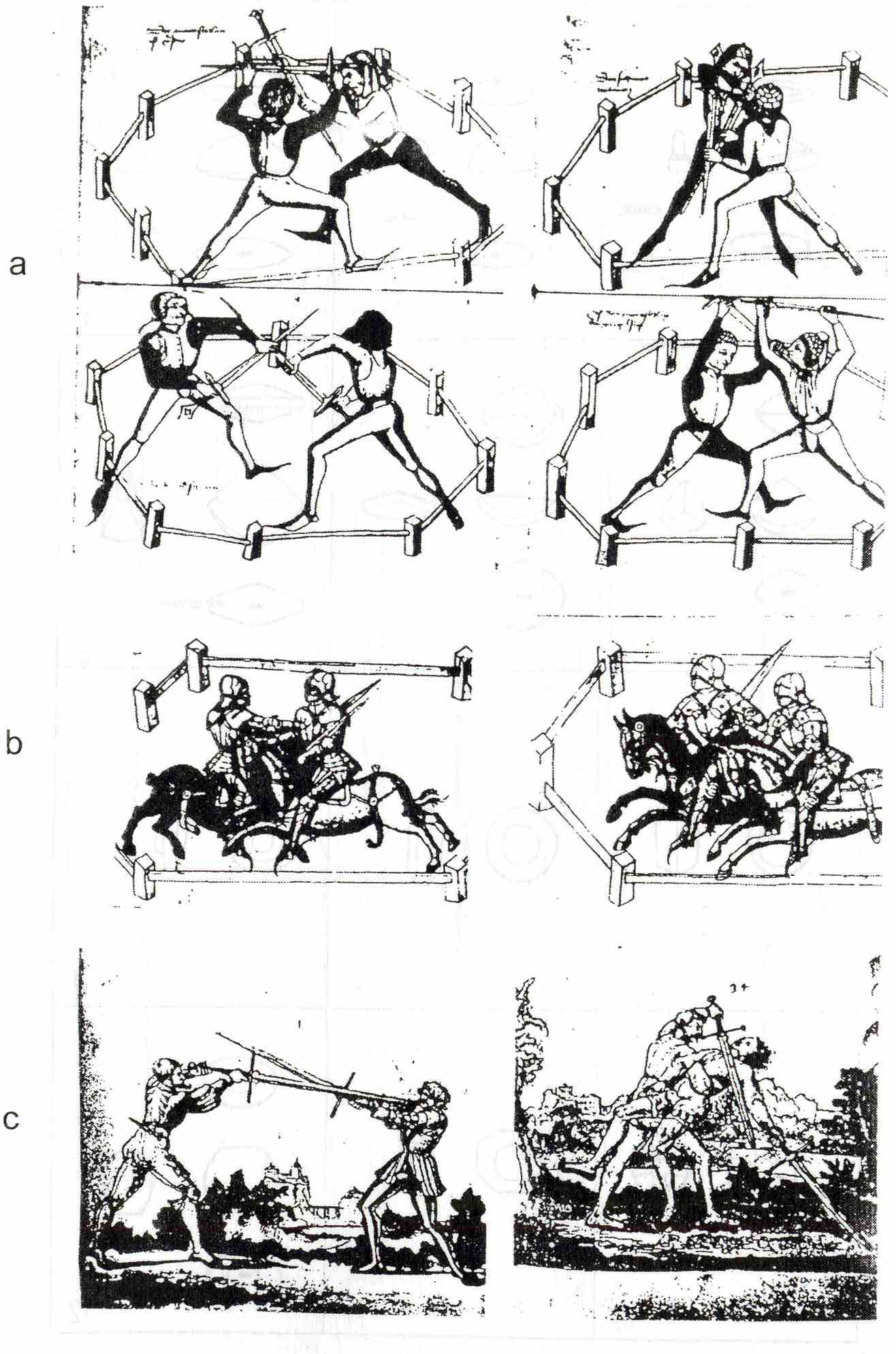 d, luptă de turnir din Codex Manesse, sec. XIV; e, lupta din faţa