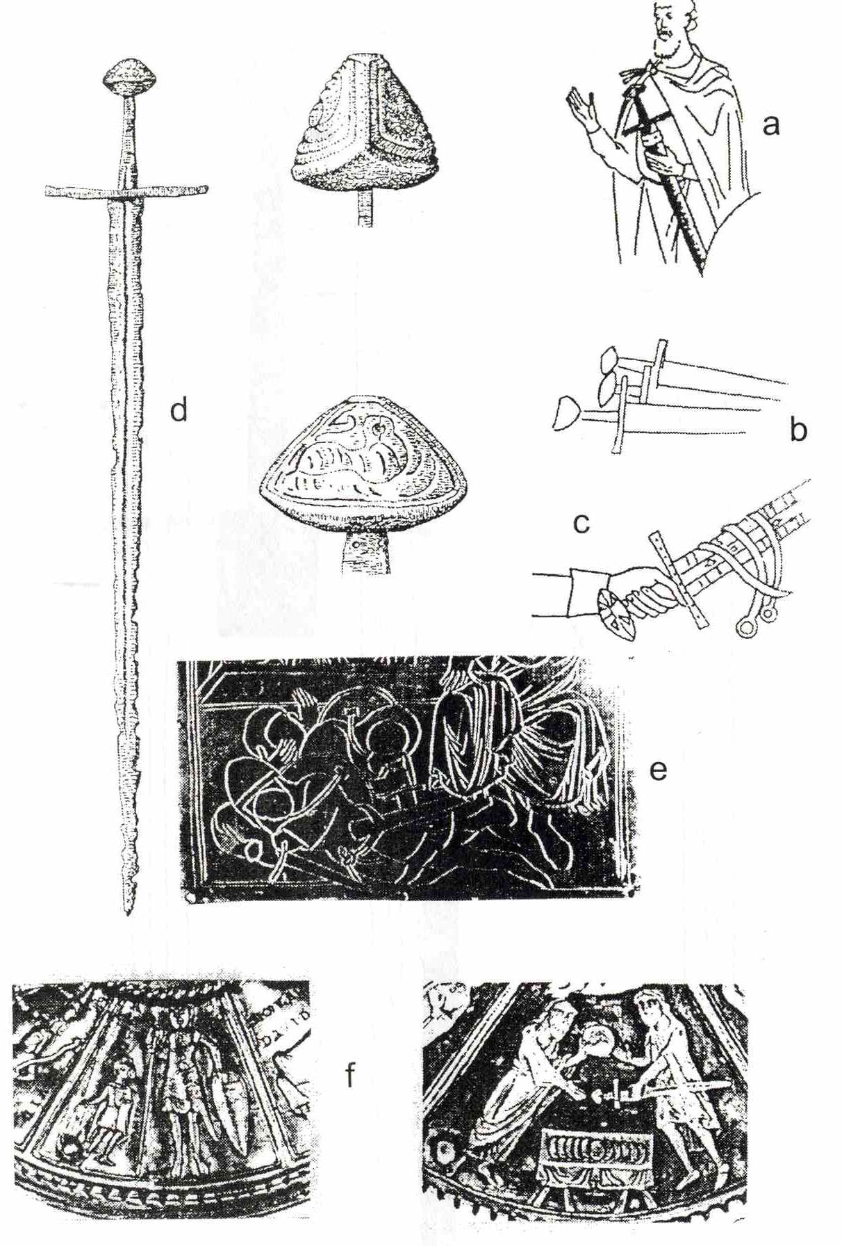 Planşa 35: Reprezentări de spade cu buton lenticular; a, manuscrisul de la Reichenau 983-991. (după Oakeshott); b, pe un altar de la Hildesheim, 1120. (după Nicolle); c, pe un sacramentar de la Regensburg, 1002-1004. (după Oakeshott); e, pe altarul de la Klosterneuburg 1181; f, pe potirul de la Trzemeszno, sec. XII.