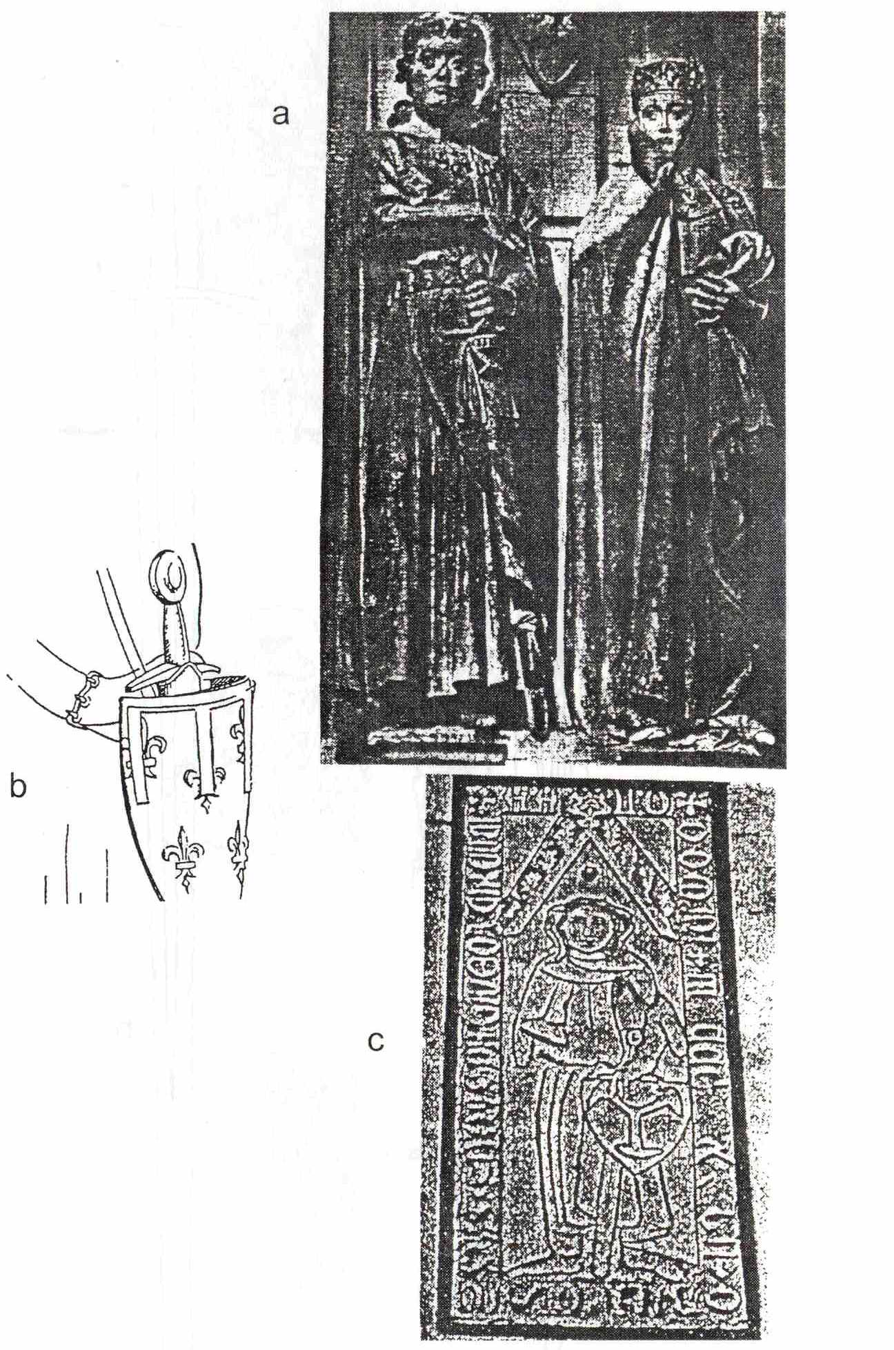 Planşa 43: a, Grupul statuar Ekkehard şi Uta, Domul din Naumburg; b, efigia contelui Robert d' Artois, †1317, St. Denis. (după Oakeshott); c, placa de mormânt de la Bistriţa. (după Vătăşianu)